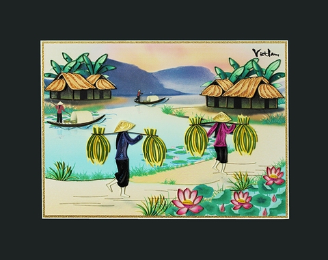 - Bức tranh này được làm bởi những phụ nữ lành nghề ở các địa phương, theo chương trình hỗ trợ việc làm xã hội của Hiệp hội Thủ công Mỹ nghệ Việt Nam.