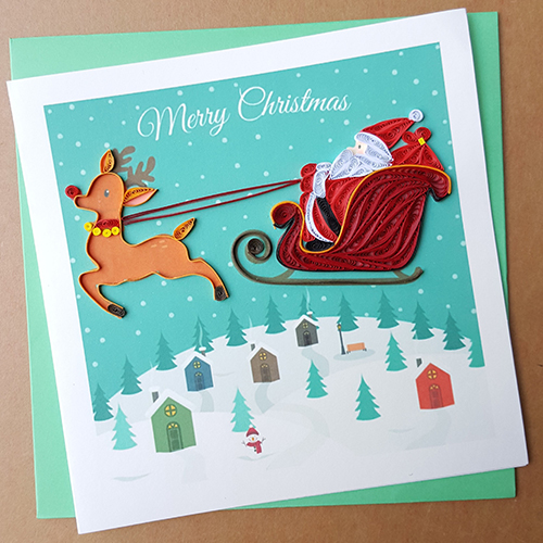 Thiệp giấy xoắn Ông giá Noel cưỡi tuần lộc rất được nhiều bạn lựa chọn vì tính phổ biến của nó.